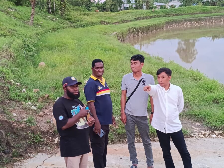 Kepala BWS Papua Barat, Wempy Nauw dan staf saat mengajak wartawan ke lokasi talud Sungai Mariat yang bergeser dan patah akibat banjir. (Rusmin/Radar Sorong)